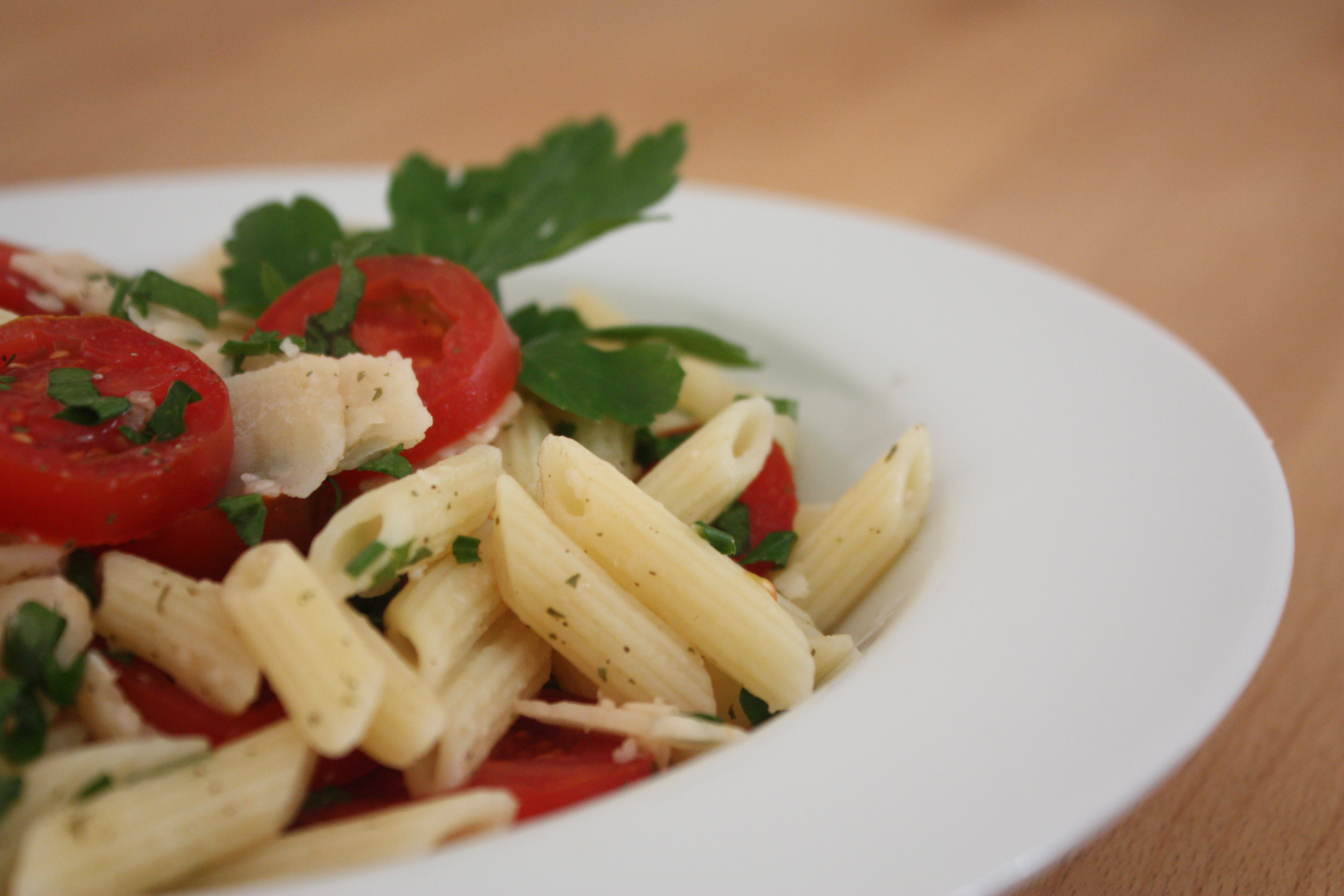 Nudeln, Tomaten, glatte Petersilie und Parmesan.