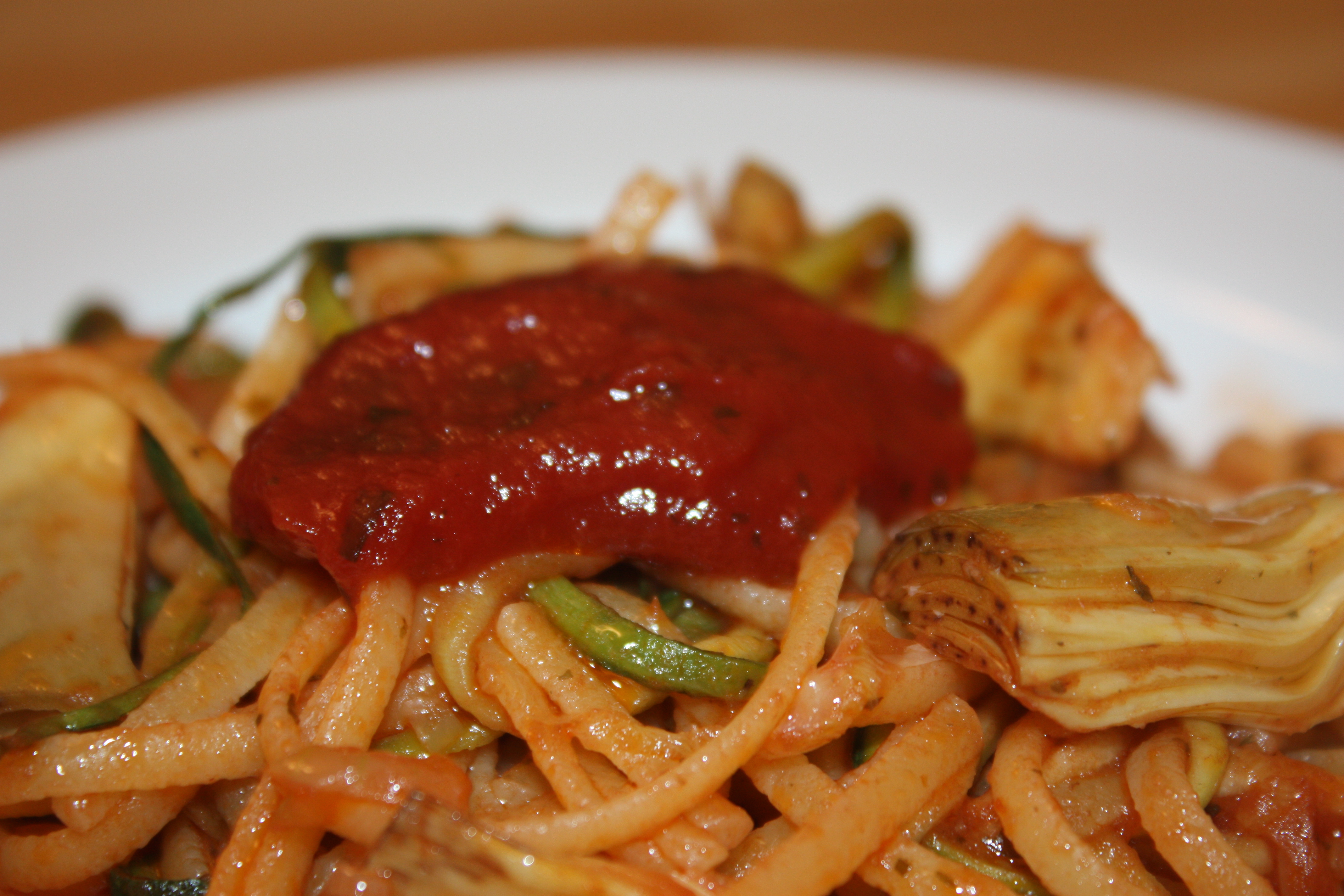 Nudeln nach Packungsanweisung kochen. Zwischenzeitlich die Zucchini mit dem Messer in feine Streifen schneiden (oder mit dem Julienneschneider). In einer Pfanne Olivenöl erhitzen, darin die Zwiebeln anbraten, dann die Zucchini zugeben. Nun den Knoblauch zugeben. Zuletzt die Nudeln, die Artischockenherzen und das Ketchup zugeben und gut mischen. Nach Belieben noch Gewürze zugeben (ich habe gar keine Gewürze zugegeben), auf einen Teller geben und mit einem Klecks Ketchup Culinair anrichten.