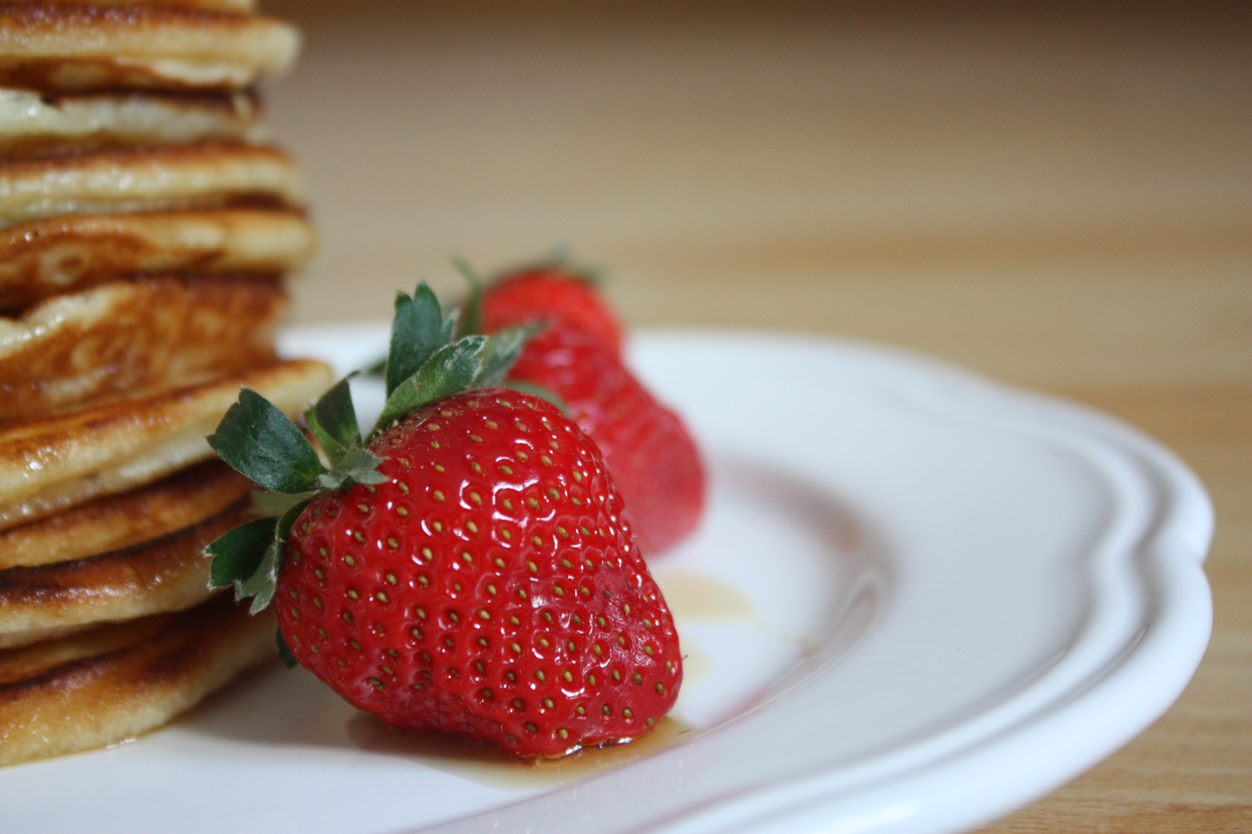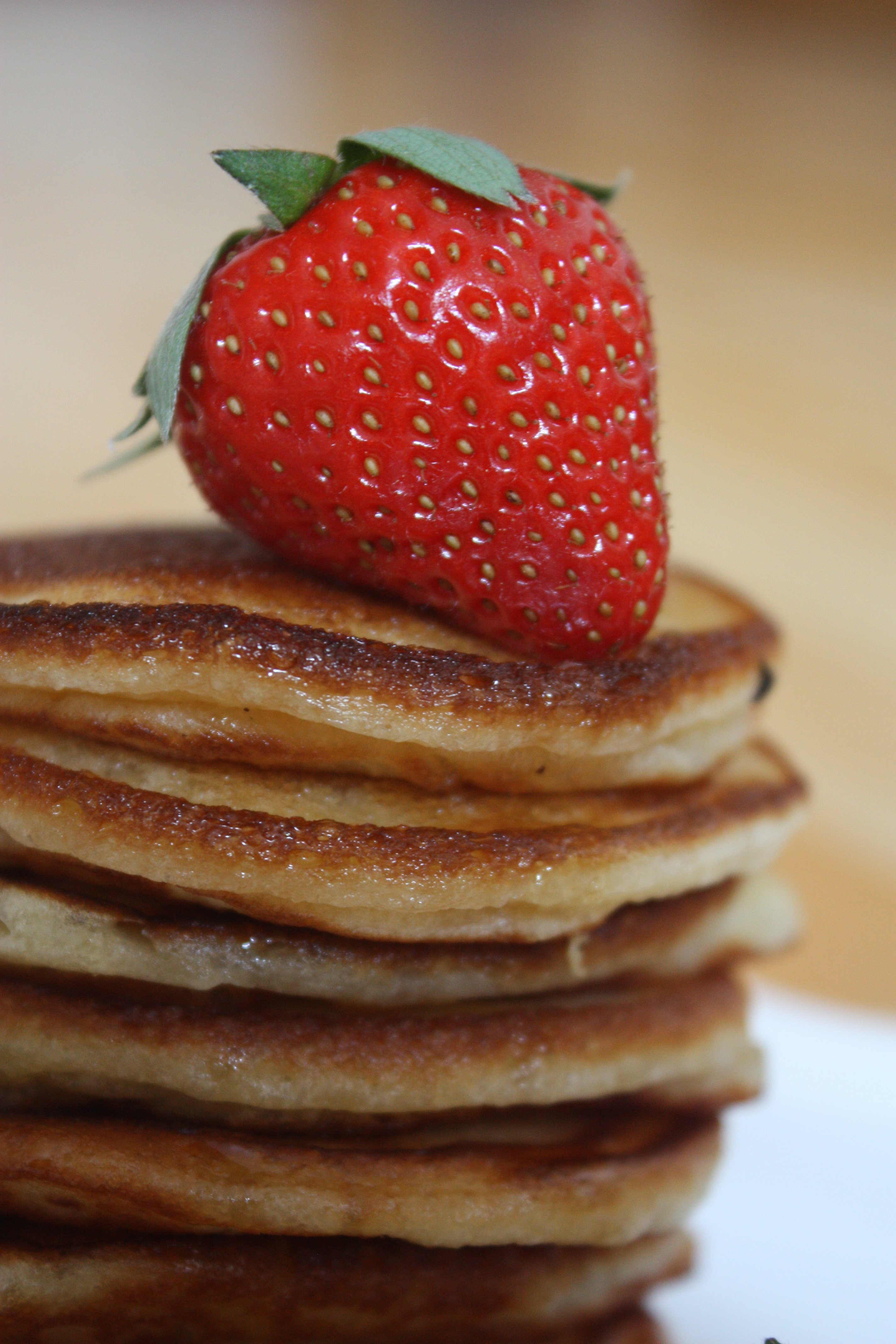 … leckere Pancakes mit frischen Erdbeeren und Ahornsirup! Nach so einem Frühstück kann der Tag doch dann auch nur gut werden… Und wer Angst hat, zu verhungern, bevor die Pancakes fertig sind, dem sie gesagt: So lange dauert es nicht! Und ihr könnt euch ja unterdessen ein paar frische Erdbeeren schmecken lassen… Schließlich muss ja jemand probieren, ob die überhaupt schmecken 😀