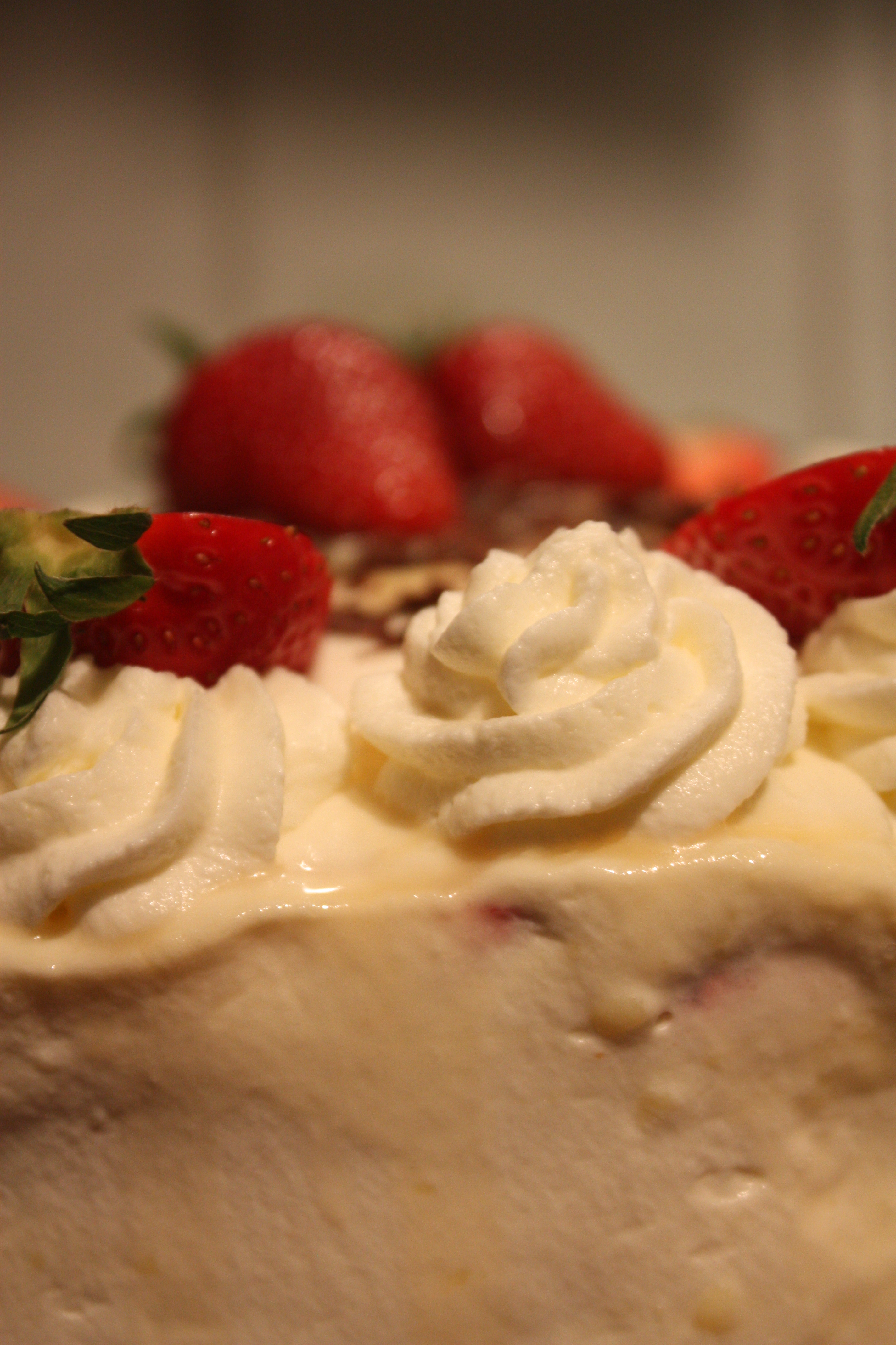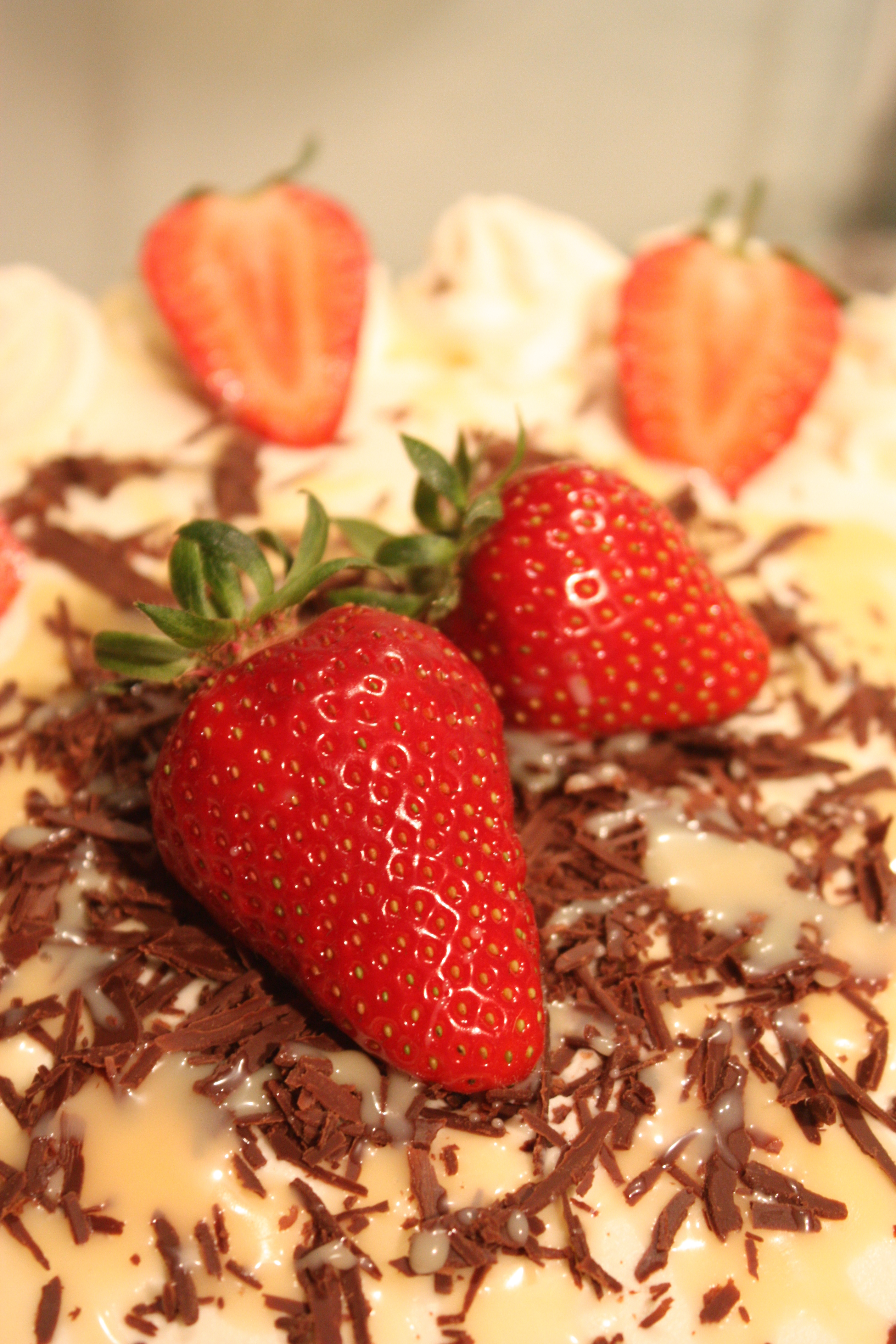 Jetzt gehts ans zusammenbauen 🙂 Der Boden wird mit einem großen Messer in 3 Teile geteilt. Das unterste legt ihr direkt auf die Tortenplate. Jetzt wird Creme daraufgestrichen und dann kommt eine gute Portion in Stücke geschnittene Erdbeeren darauf. Dann der nächste Boden, Creme und wieder Erdbeeren. Nun kommt der letzte Boden. Ich habe darauf nochmals Creme und Erdbeeren verteilt, einfach weil ich es gern cremiger und fruchtiger wollte. Allerdings hat es das ganze auch etwas ‚instabiler‘ gemacht. Deshalb entscheidet selbst, was ihr wollt 😉 Dann hab ich Sahne mit Vanillezucker und Sahnesteif geschlagen und die Torte an den Seiten und oben damit bestrichen. (Ein bisschen Sahne muss allerdings weggestellt werden für die kleinen Sahnehäubchen auf der Torte!) Das ist etwas knifflig, aber mit etwas Fingerspitzengefühl wird das schon! So und jetzt kommt die Deko. Mit einem Löffel die Dulche di leche am Rand der Torte verteilen, sodass ein bisschen davon runtertropft. Dann ein paar ‚Spritzter‘ über die Torte geben. Jetzt kommen die Sahnehäubchen. Wichtig ist, dass ihr davon eine gerade Anzahl habt, sonst geht es nicht auf mit der Deko. Auf jedes zweite Häubchen kommt eine halbierte Erdbeere. Nun noch die Schokolade in der Mitte über die Torte streuen, zwei schöne Erdbeeren darauf setzen, fertig!