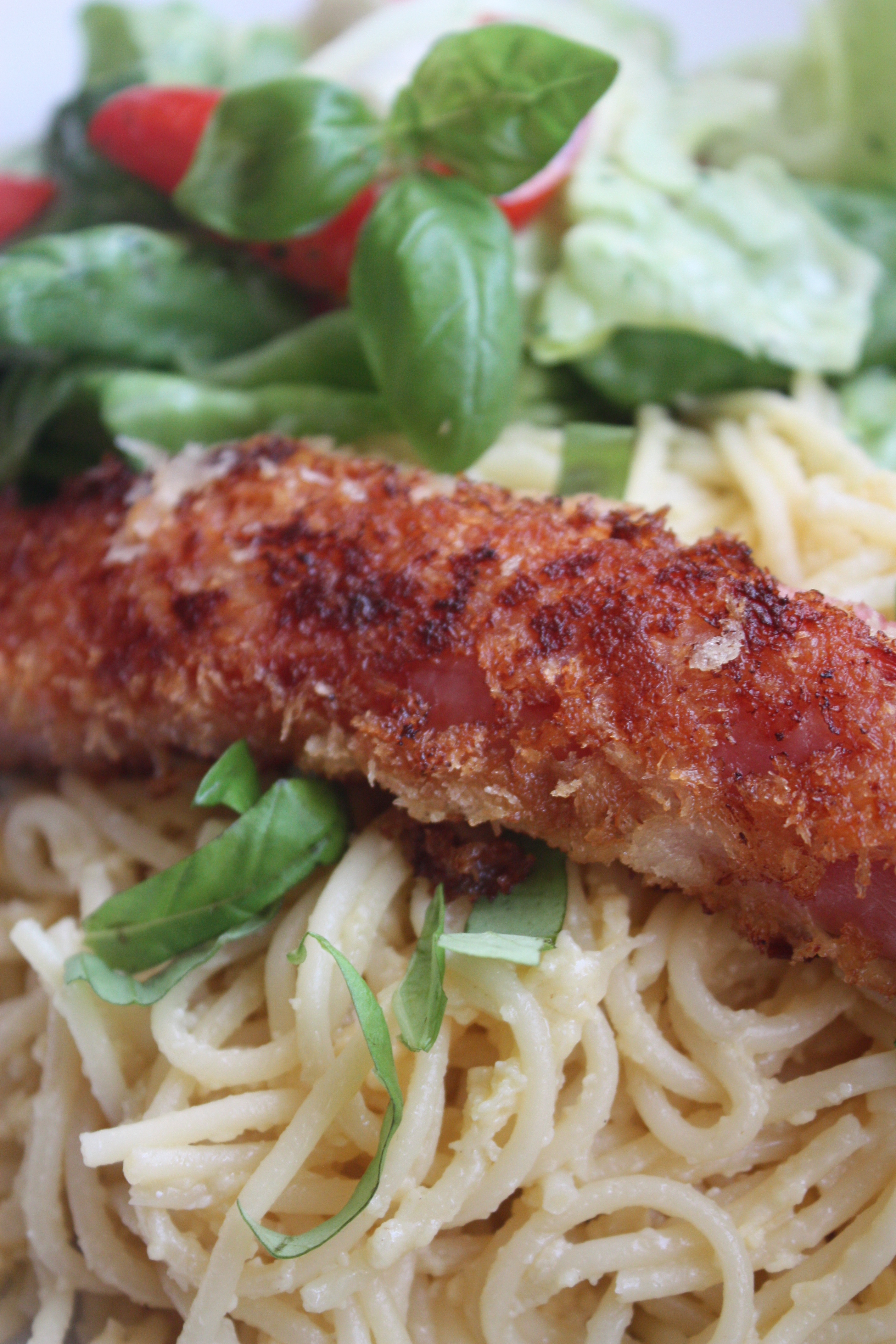 Spaghetti Carbonara mit Spargel in Pankokruste