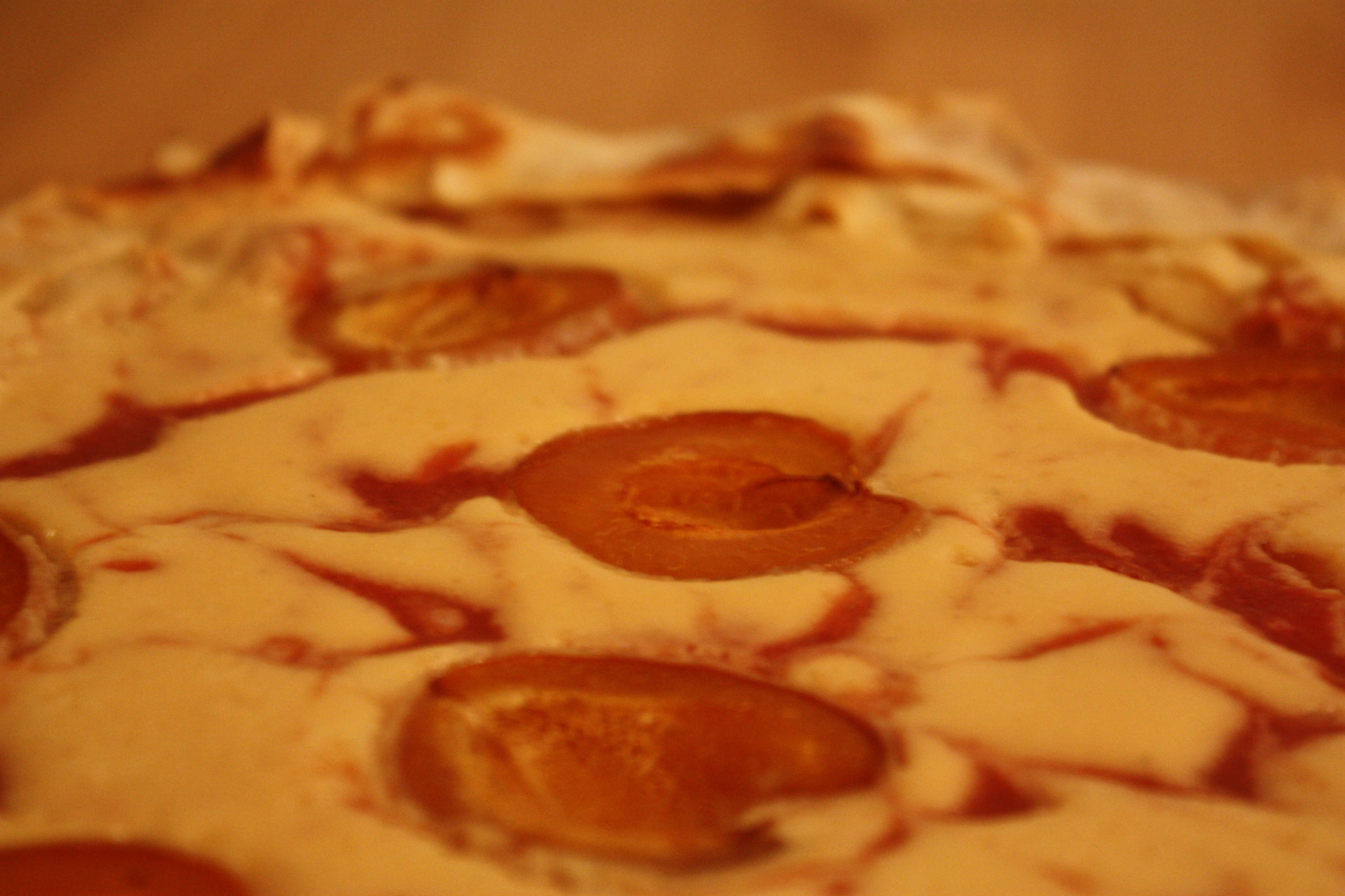 Die Aprikosen waschen und halbieren und mit der Schnittfläche nach oben auf den Kuchen legen lassen.