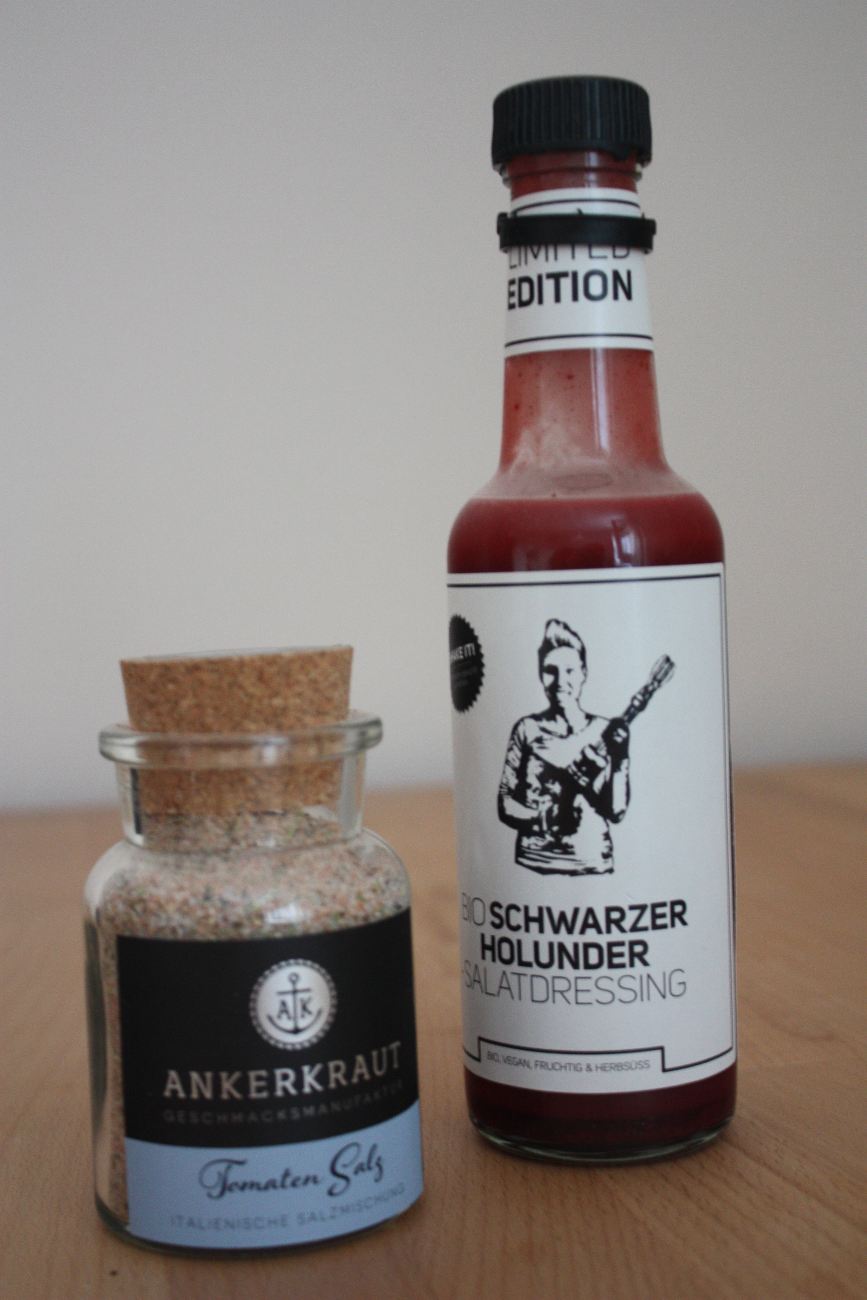 habe ich schnell einen Blick in die Foodvibes-Box (http://foodvibes.de/produkt/vegan-food-box/) geworfen, die ich bei Linns Love Food (https://linnslovefood.wordpress.com/) gewonnen habe, denn ich war sooo gespannt! Als ich heute wieder zu Hause war, musste ich natürlich gleich etwas davon probieren! Also gabs ein leckeres Abendessen und ich konnte 3 der tollen Produkte ausprobieren: Einen leckeren Orange-Ingwer-Eistee von ‚AILAIKE‘ (http://www.ailaike.de/), ein geniales Tomatensalz von ‚ANKERKRAUT‘ (http://www.ankerkraut.de/) und ein Holunderdressing von ‚FRESHHUNTER‘ (http://www.freshhunter.de/)! Und ich bin von allen 3 Produkten total begeistert! Der Eistee ist gekühlt wirklich sehr erfrischend und überhaupt nicht süß, genau so mag ich es! Und an einem heißen Tag wie heute ist das genau das Richtige! Das Tomatensalz wird mein neuer Sommerliebling, denn ich liebe Tomaten! Als Salat, auf dem Brot, als Bruscetta… Und heute hat es meinen Tomatensalat verfeinert, es hat einen sooo tollen Geschmack! Und die Salatsoße ist etwas ganz Besonderes, die Farbe ist großartig und sie schmeckt dazu noch sehr gut, was will man mehr? Heute zu meinen Blattsalaten (aus meinem eigenen ‚Garten‘, ich bin stolz wie Oskar!) war sie richtig lecker! Ich kann euch also alle drei Produkte absolut empfehlen und sag nochmal: Danke Linn, danke Foodvibes ❤