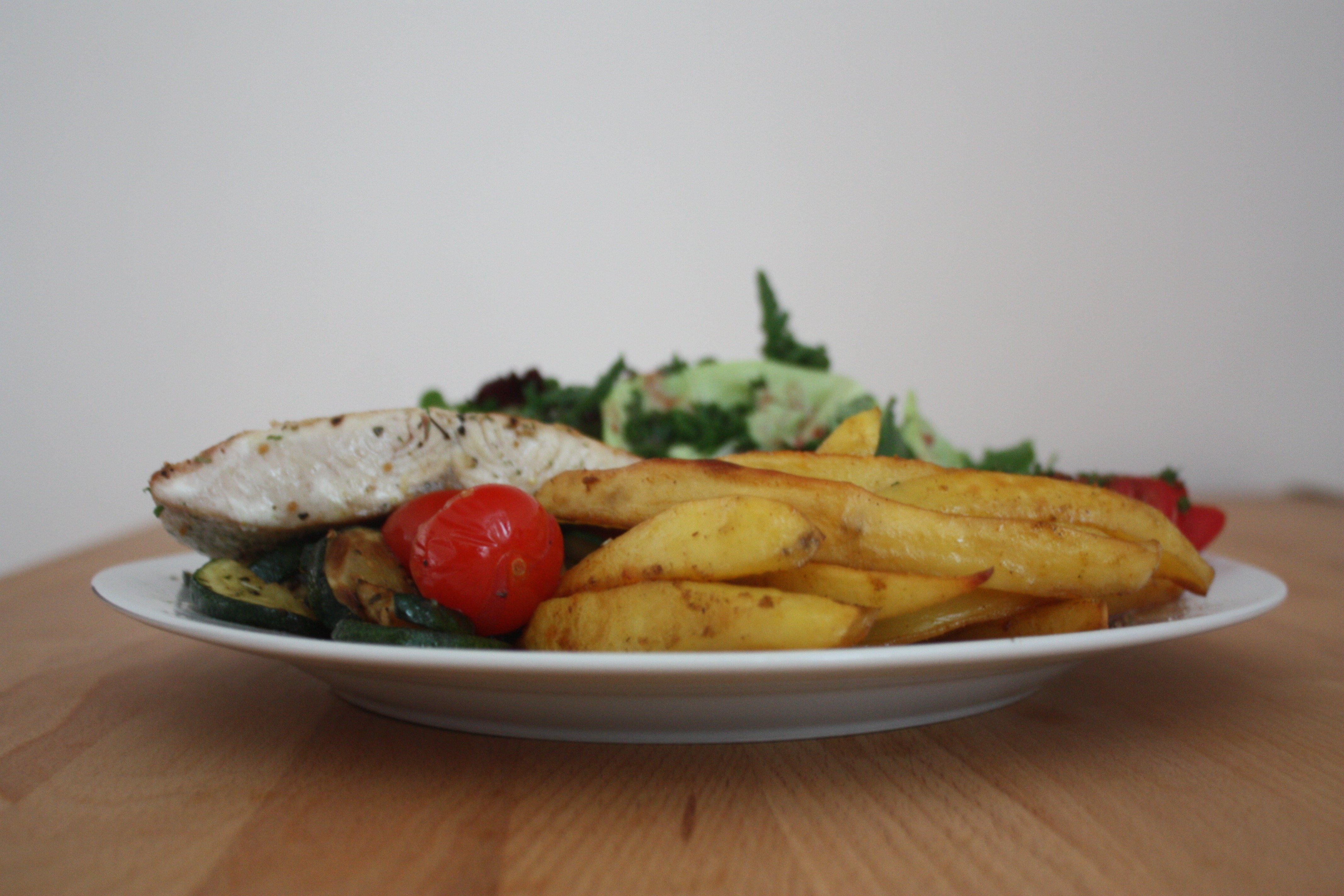 Die Kartoffeln hab ich geschält und geschnitten, mit Curry, Rosenpaprika, Pfeffer und Salz gewürzt und im Ofen bei 200°C gebacken. Die Zucchini hab ich gewaschen, gewürfelt, mit Salz, Pfeffer und Kräutern der Provence gewürzt und angebraten. Kurz vor Ende hab ich ein paar Cocktailtomaten dazu gegeben. Den Fisch hab ich gewürzt (ich hab ein Fischgewürz, Salz und Pfeffer tun es aber auch) und angebraten. Dazu gabs Blattsalate mit Holunderdressing und einen Tomatensalat mit dem leckeren Tomatensalz und ein klein bisschen Balsamico. Genaue Rezeptangaben hab ich euch heute nicht, solltet ihr etwas genauer wissen wollen- Meldet euch einfach 😀